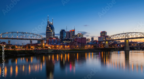 Naklejka premium Nashville Skyline at Dusk: River Reflections, City Lights, and Bridges of...