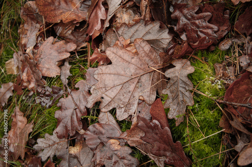 Fototapeta premium Nasse Eichenblätter auf Moos