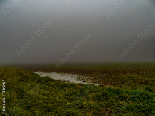 © focus finder, Fototapeta premium Nasser Ackerboden im Nebel