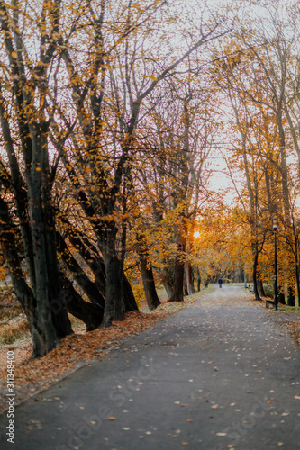 © volf anders, Obraz premium Naszywka w parku o zachodzie słońca jesienią