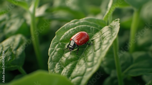Fototapeta premium National Be Nice to Bugs Day Ladybug on leaf in lush greenery close-up with natural lighting