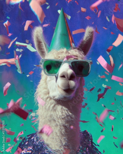 © Breezze, Obraz premium National Blame Someone Else Day Llama in Party Hat and Sunglasses with Confetti Celebrating April Fools Day and Spring Sales Event Fun