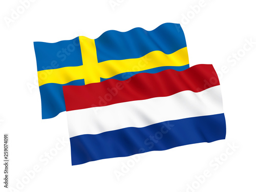 © epic, Fototapeta premium National fabric flags of Netherlands and Sweden isolated on white background. 3d rendering illustration. Proportion 1:2
