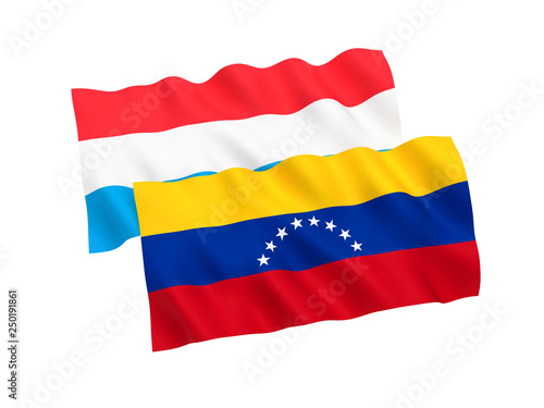 Naklejka premium National fabric flags of Venezuela and Luxembourg isolated on white background. 3d rendering illustration. 1 to 2 proportion.