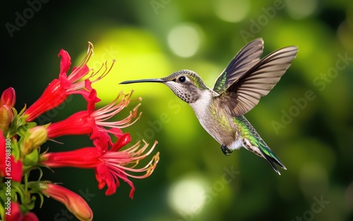 © Антон Федченко, Obraz premium National Geographic Tiny Hummingbird hovering beside a bright red flower, wings beating rapidly, sunlight catching iridescent green feathers