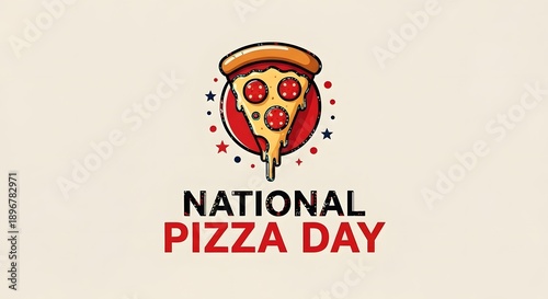 Fototapeta premium National pizza day logo with a slice of pizza and festive design elements on a beige background