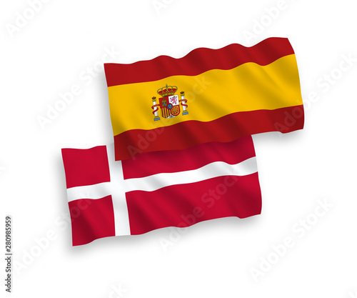 © epic, Fototapeta premium National vector fabric wave flags of Denmark and Spain isolated on white background. 1 to 2 proportion.
