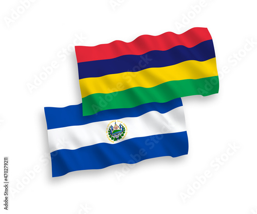 Obraz premium National vector fabric wave flags of Republic of El Salvador and Republic of Mauritius isolated on white background. 1 to 2 proportion.