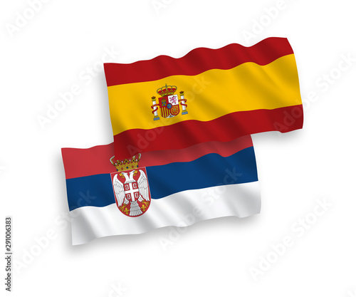 Fototapeta premium National vector fabric wave flags of Serbia and Spain isolated on white background. 1 to 2 proportion.