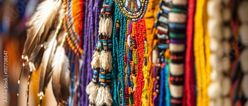 © Olena Panasovska, Naklejka premium Native American craftwork featuring colorful beaded necklaces, white feathers, and intricate woven patterns arranged in vertical stripes. Generative AI