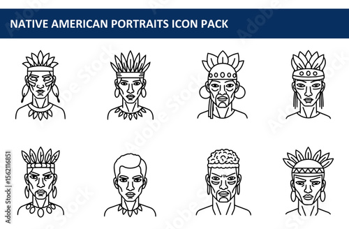 © Flatart, Fototapeta premium Native American male portraits in traditional headdresses and adornments. Portraits in a line art style with various facial expressions.