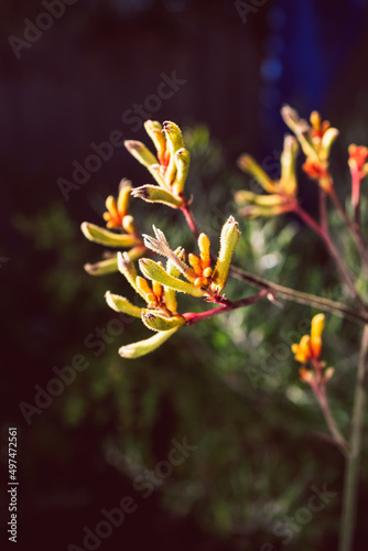 © faithie, Fototapeta premium native Australian kangaroo paw plant with orange yellow flowers in tropical backyard