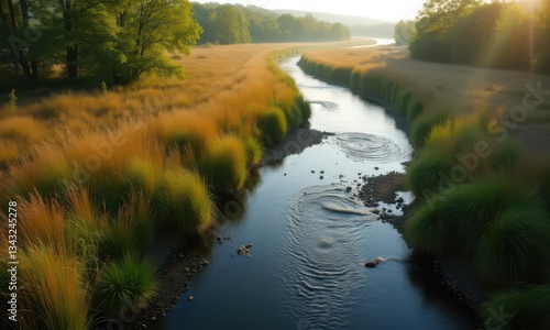 © Igor, Obraz premium Native plant restoration of riparian zone with meandering stream, aerial view of ecological recovery project showing willows and sedges preventing erosion along waterway