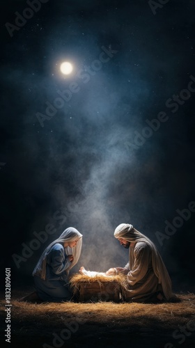 © ActionGP, Fototapeta premium Nativity scene at night with Mary and Joseph beside the baby in a manger under moonlight