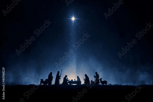 © Oleg, Naklejka premium Nativity scene illuminated by a bright star during a peaceful night