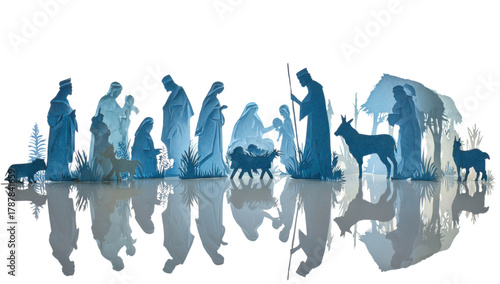 © PS Poppy, Obraz premium Nativity Scene in Silhouette: A serene silhouette of the nativity scene, capturing the sacred event of the birth of christ, embodies the true spirit of Christmas, radiating peace and reverence.