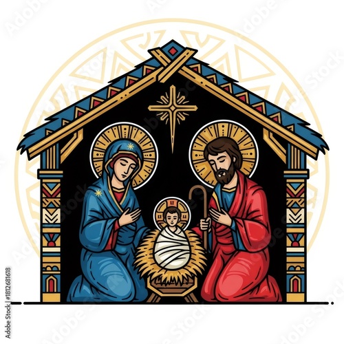 Fototapeta premium Nativity scene with woman mary, man joseph and baby Jesus in a wooden manger....