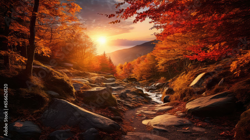Fototapeta premium Natural autumn landscape with the sun in the forest and a mountain of orange...