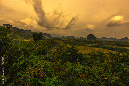 Naklejka premium Natural background, high angle from the high mountains that can see the scenery around, the wind blows through the cool, blurred of traveling, the integrity of the moist forest.