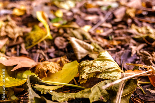 Fototapeta premium Natural background of dried leaves focused on the foreground and unfocused...