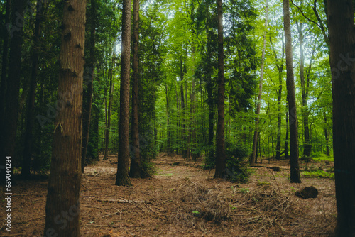 Obraz premium Natural background of pine forest, camera between trees.