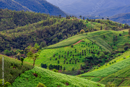 © bangprik, Fototapeta premium Natural background on the mountain with green rice terraces. Pa Bong Piang is one of the beautiful viewpoints in Chiang Mai, Thailand, overlooking the surrounding mountains. It is always popular.