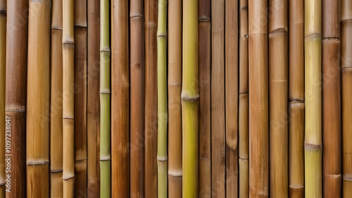 © EPDICAY, Fototapeta premium Natural bamboo fence texture with vertical brown wooden boards, perfect as a tropical plant-inspired background.
