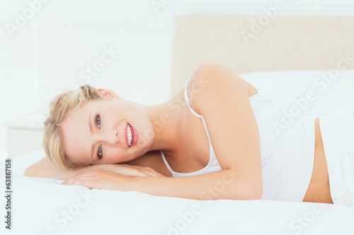 Fototapeta premium Natural blonde lying on her bed smiling at camera