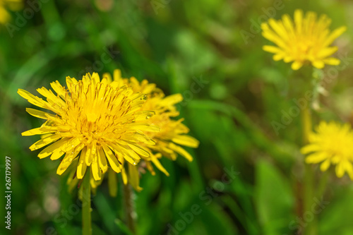 Naklejka premium Natural blooming background of yellow beautiful dandelions.