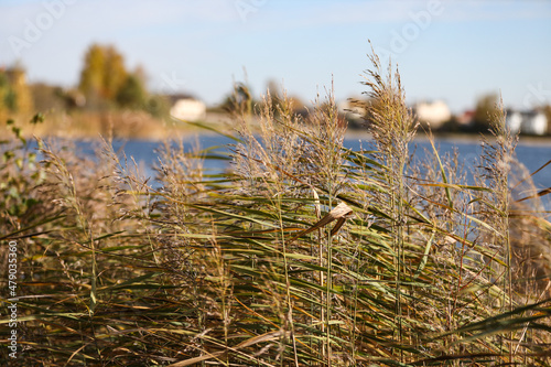 Obraz premium Natural close-up photo of seagrass growing near lake.
