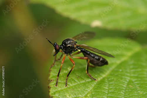 Naklejka premium Natural closeup on the Scarce Red-legged Robberfly, Dioctria cothurnata sitting on a leaf
