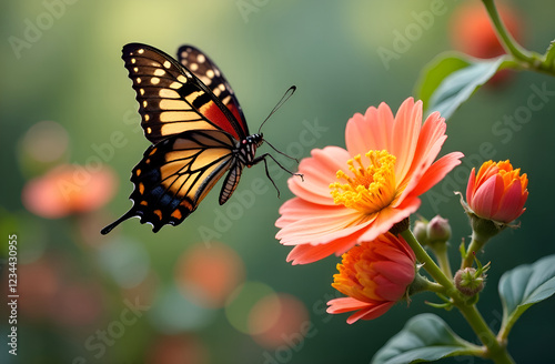 © Elena Verba, Fototapeta premium Natural composition with flowers and butterflies, template, postcard. Selective focus, blurred background.