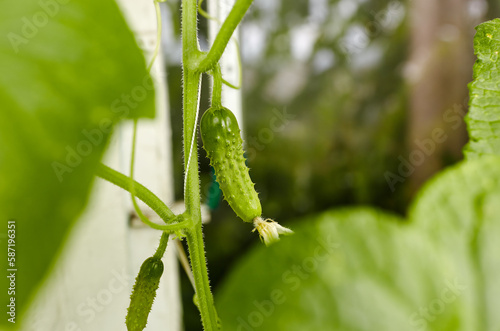 Naklejka premium Natural cucumber grows in a greenhouse. Growing fresh vegetables in a greenhouse