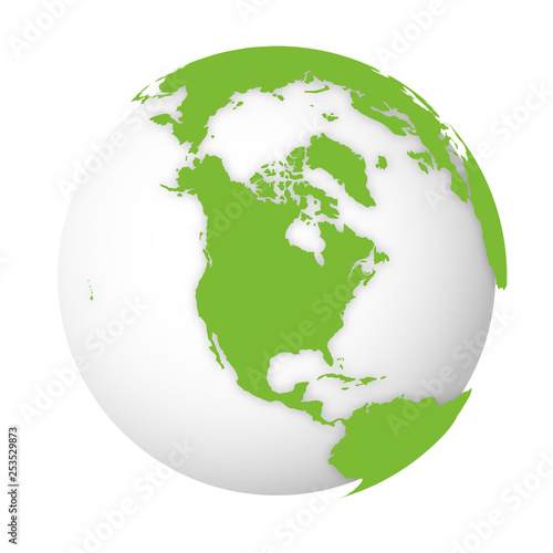 © pyty, Naklejka premium Natural Earth globe. 3D world map with green lands dropping shadows on white globe. Vector illustration
