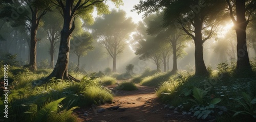 © Kachaphot, Naklejka premium Natural environment with plants and trees in the foreground, with a subtle glow effect on the foliage, nature, foliage