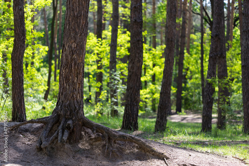 Fototapeta premium Natural forest background with trunks and greenery of trees or reserved city...