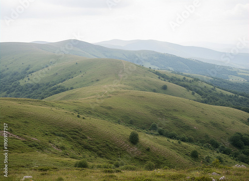 Obraz premium Natural Green Hills and Mountains Under Soft Daylight with Rolling Terrain and Lush Vegetation