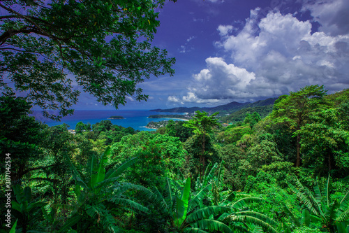 © bangprik, Obraz premium Natural high angle panoramic background With an atmosphere surrounded by mountains and trees, with a blurred wind, cool