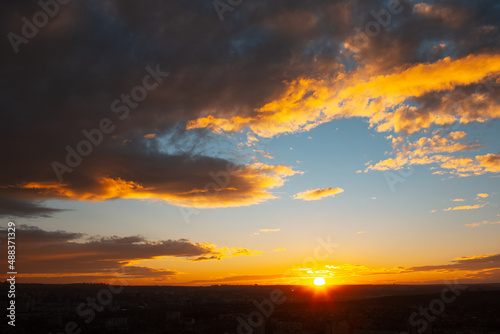 © Lalandrew, Obraz premium Natural landscape of beautiful sunset. Dark cloudy sky.