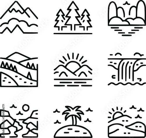 © Shorif, Fototapeta premium Natural Landscape Outline Icon Set Mountains, Trees, Lakes, and Outdoor Scenery