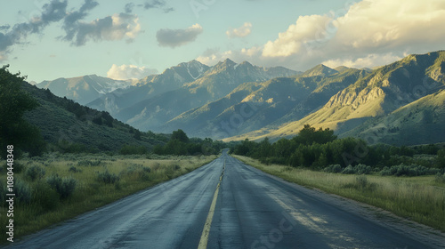 © charli, Naklejka premium Natural Landscape Road a?" Wide asphalt road with green mountains and sky, captured at sunrise -
