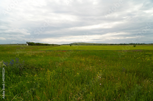 © vvicca, Fototapeta premium Natural landscape with a green field under a blue sky