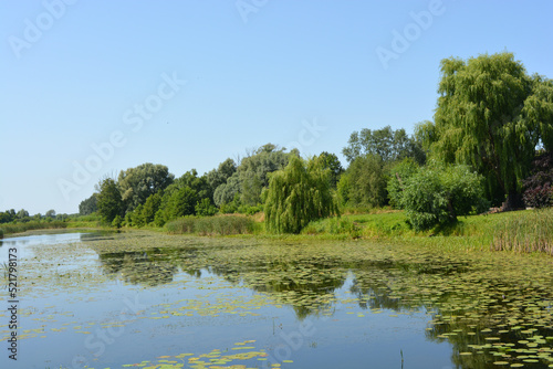 © Daria Katiukha, Fototapeta premium Natural landscapes of the Bug River - trees, hills, reeds, grass, water lilies, clear and transparent water. The river is located on the village of Rybienko Nowe, the city of Wyszkw, Poland.