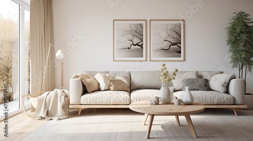 © NUSRAT ART, Fototapeta premium Natural light bathes this Scandinavian-inspired interior, highlighting a comfortable sofa, stylish coffee table, and an empty wall space ready to be transformed with personalized decor or artwork.