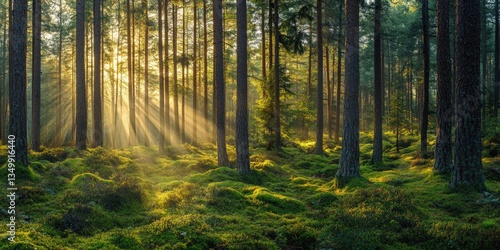 Naklejka premium Natural light shining through a forest, creating a serene and peaceful...