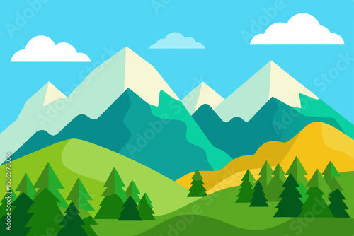 © AIYAL BI, Naklejka premium Natural mountain landscape with green trees, blue sky, and white clouds