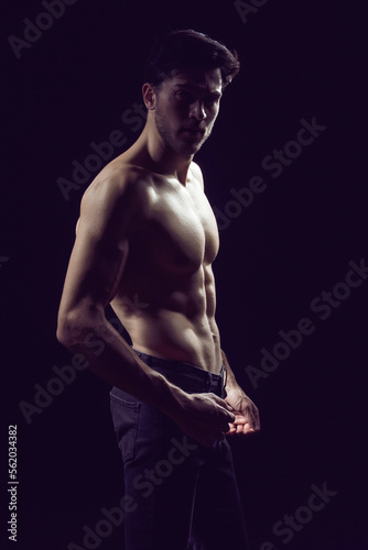 © danmorgan12, Naklejka premium Natural Portrait of Confident Thinking Caucasian Bodybuilder Athlete Man Posing With Naked Torso Against Dark