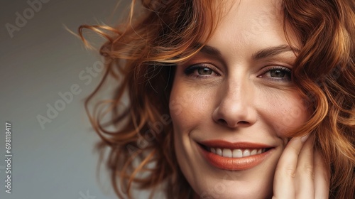 © 0livia, Fototapeta premium Natural portrait of cute middle aged woman smiling. Positive emotions and sensual look. AI generated