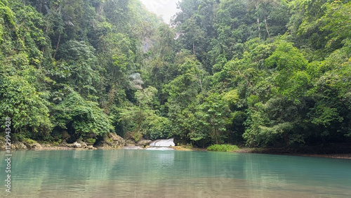 © Kadir Ibrahim, Fototapeta premium Natural scenery: trees, waterfalls, sky and blue-green river water