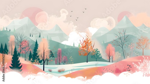 Fototapeta premium Natural Scenery with Trees, Mountains, and River – Vector Art